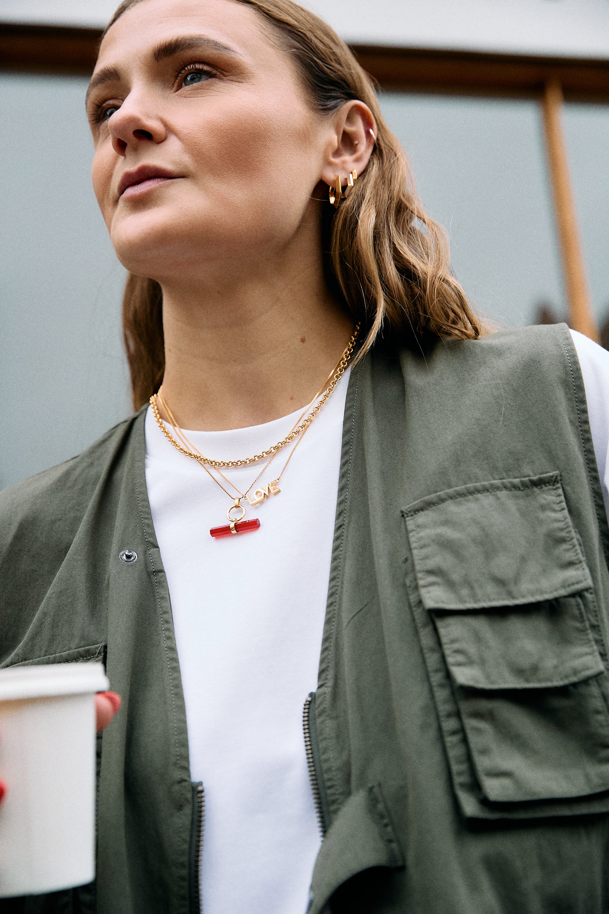 Style with the Serpentine Chain, Carnelian T-Bar Huggies and Carnelian T-Bar Bracelet for a chic, considered look.